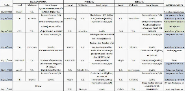 Como es costumbre, os pongo aqui el detalle del calendario de juego de los tres equipos, domingo a domingo, para que le sea más fácil a los capitanes tener una visión conjunta y que puedan hablar entre ellos. A destacar que el 20/10/2013, coincidimos en la Casa del Ajedrez Liga Andaluza y Tercera, por si la logística nos permite ir en menos coches ...